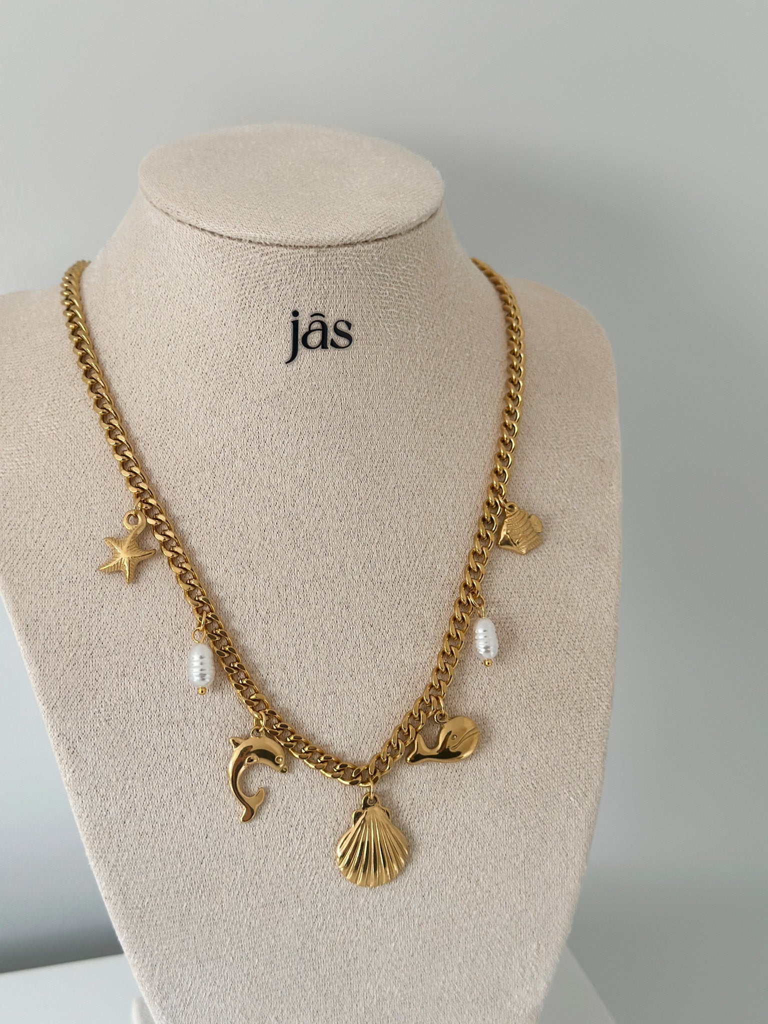 A gold chain adorned with sun and shell charms — a reminder to rise and shine, every single day.