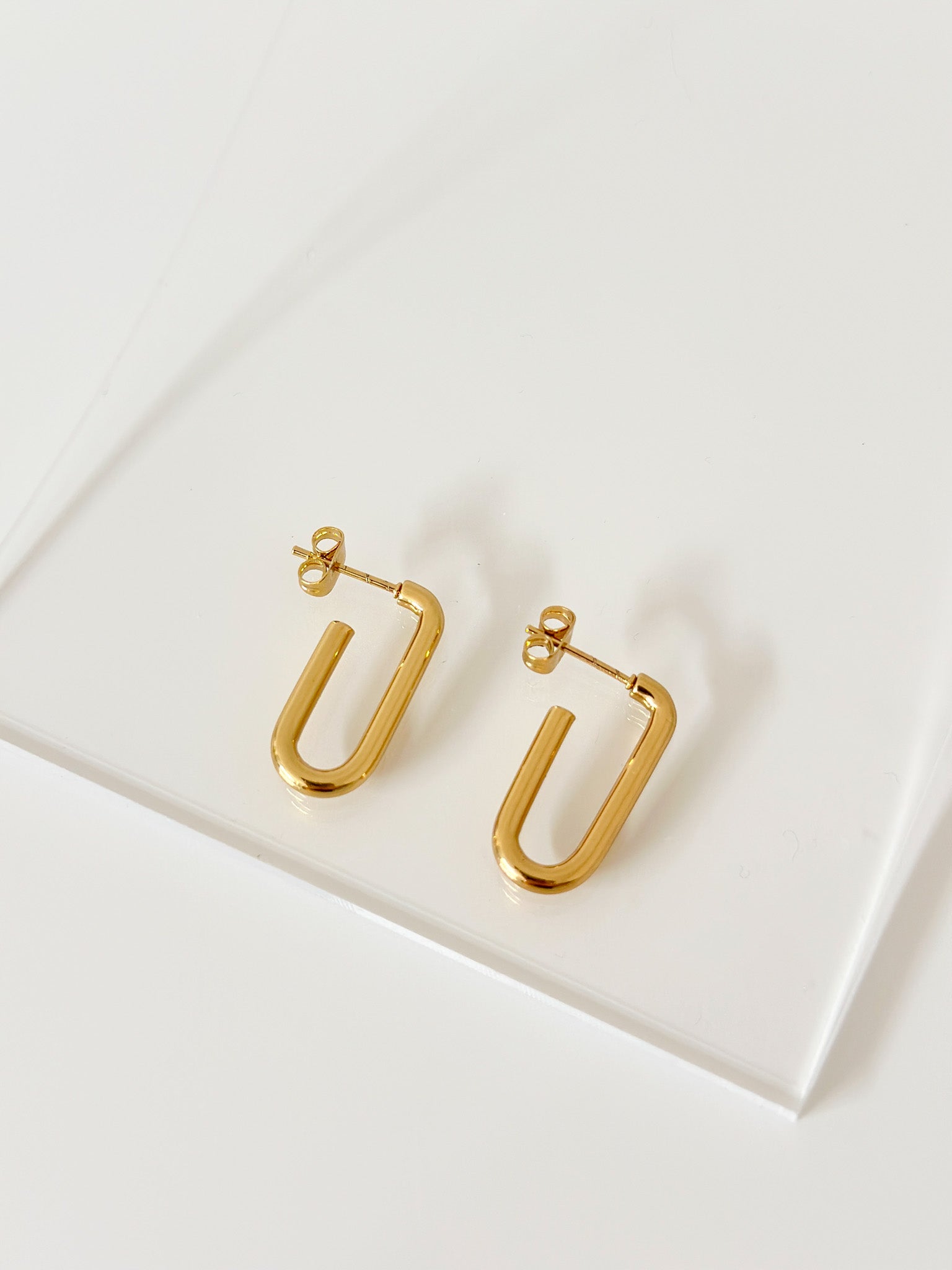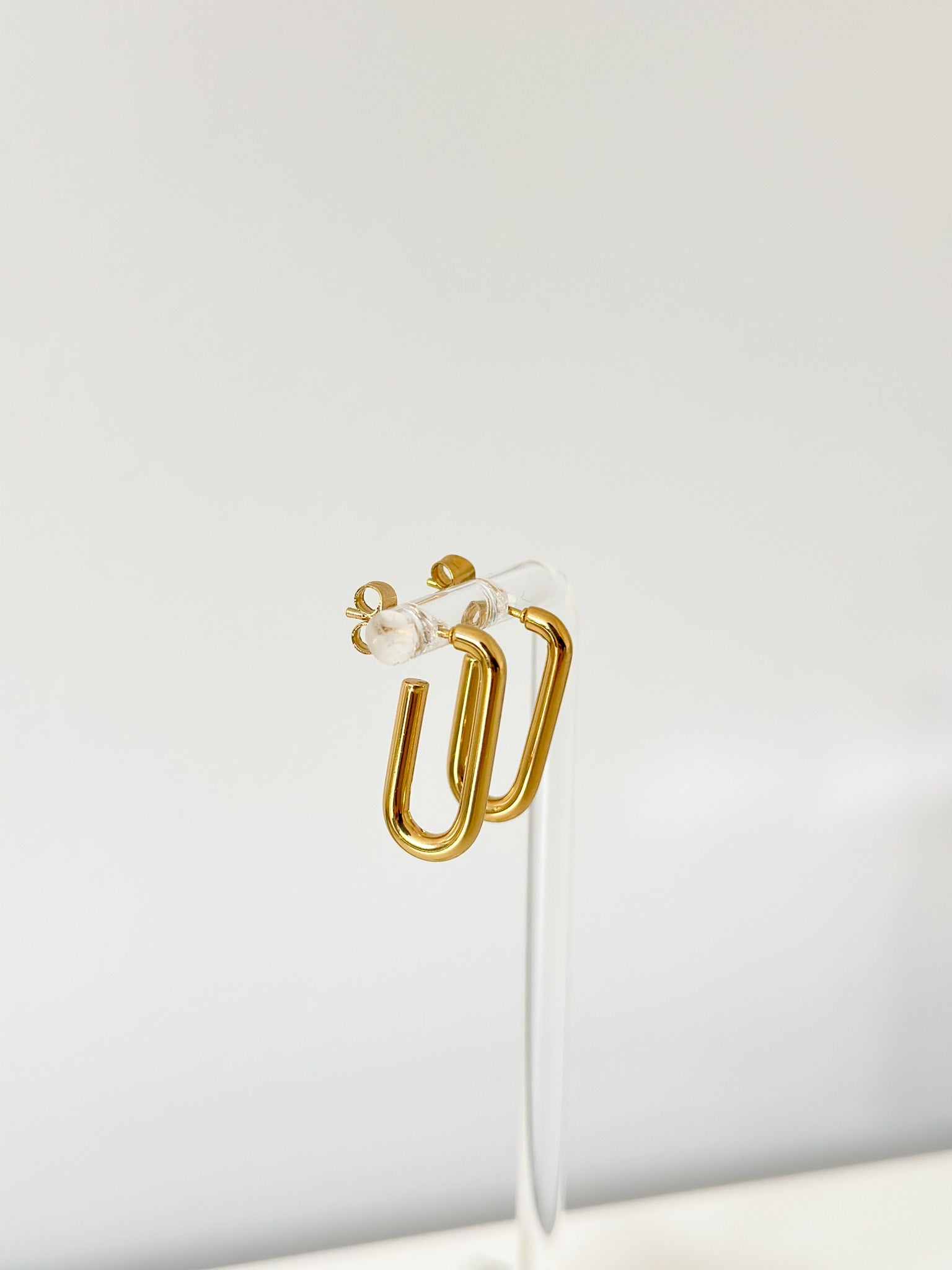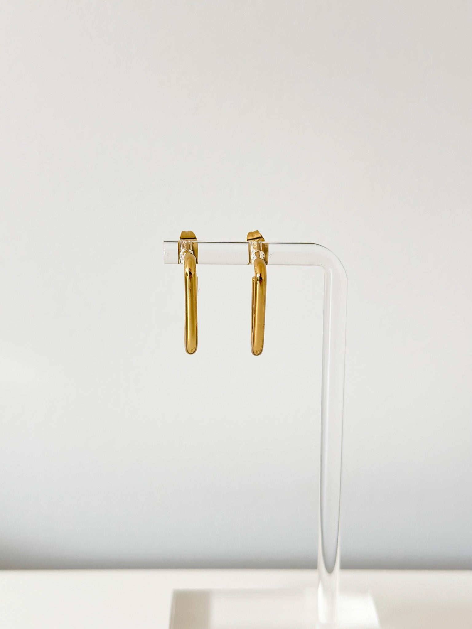 These modern rectangular drop earrings feature sleek, elongated links in polished gold stainless steel. The minimalist geometric design makes them a perfect choice for a sophisticated, contemporary look that transitions effortlessly from day to night.